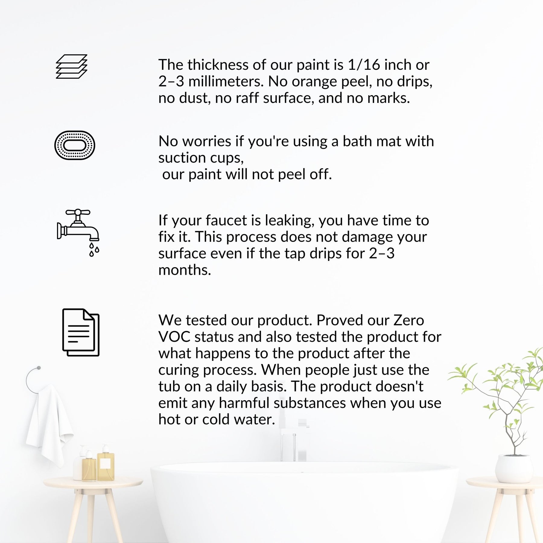 - Versatile Compatibility with Various Surfaces is designed for refinishing bathtubs made of porcelain, fiberglass, acrylic, enamel, or cast iron. This durable coating adheres easily to various materials, providing a thick, even finish that resists peeling, chipping, and fading over time.